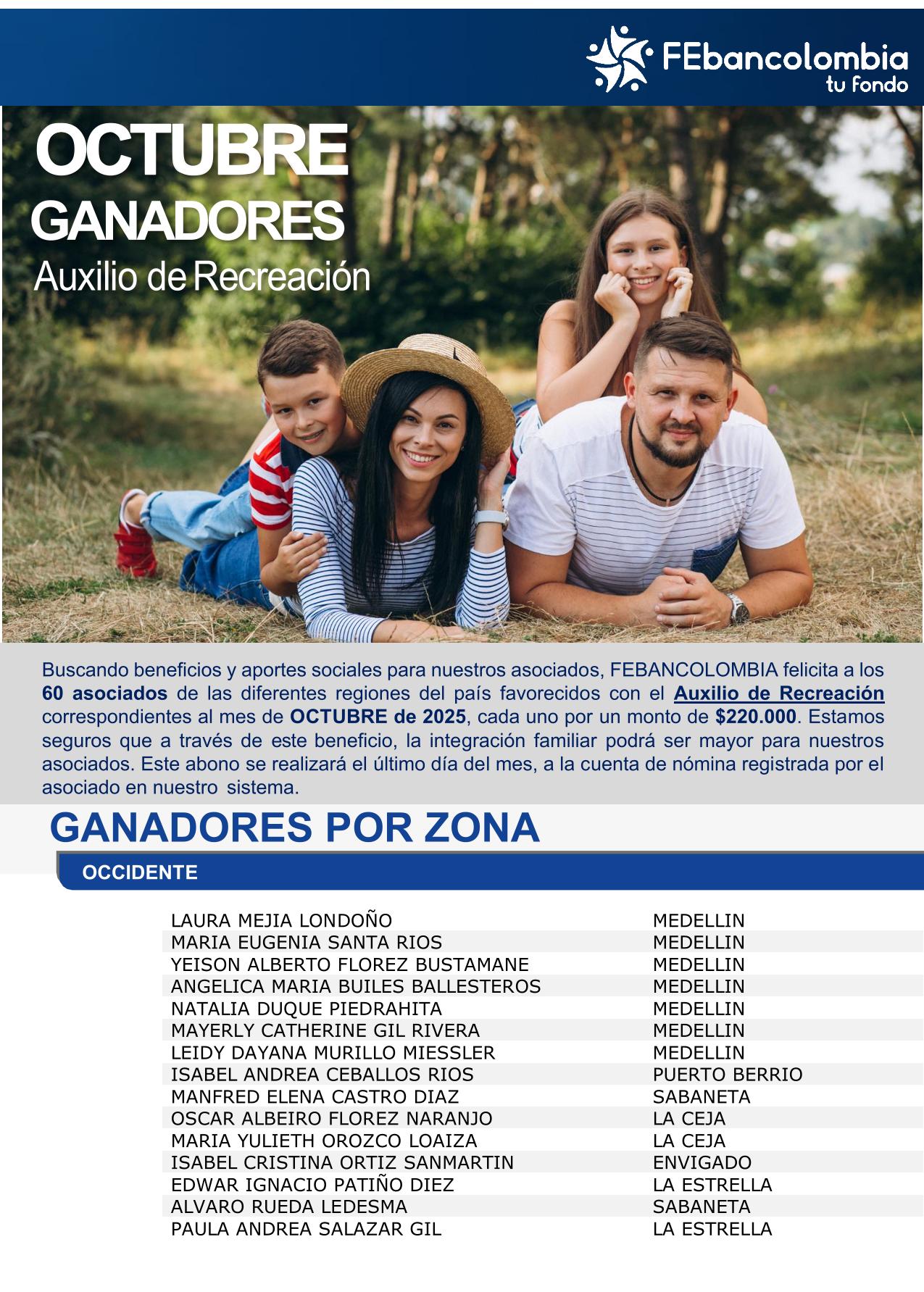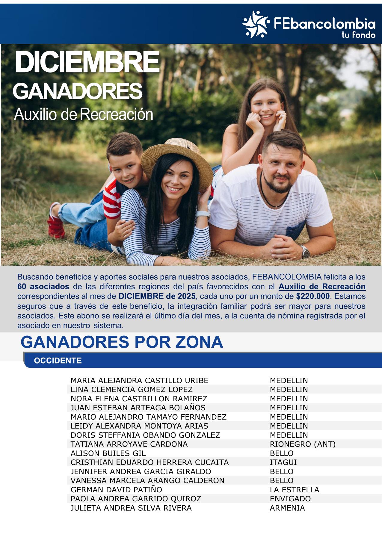 Febancolombia fomenta el esparcimiento y la integración familiar otorgando 60 auxilios mensuales de $220.000 cada uno, sorteados de forma aleatoria entre todos nuestros asociados de las diferentes regiones del país.