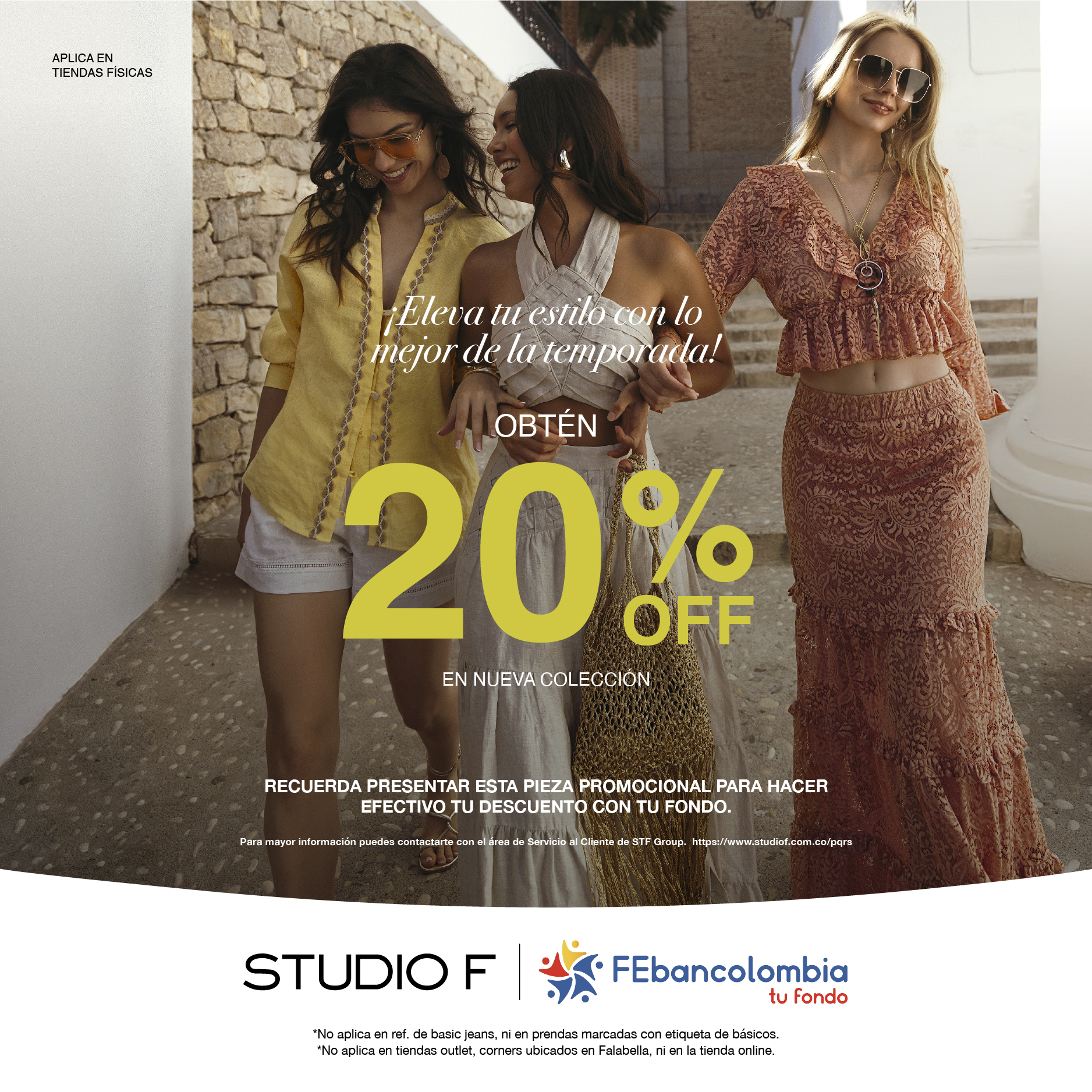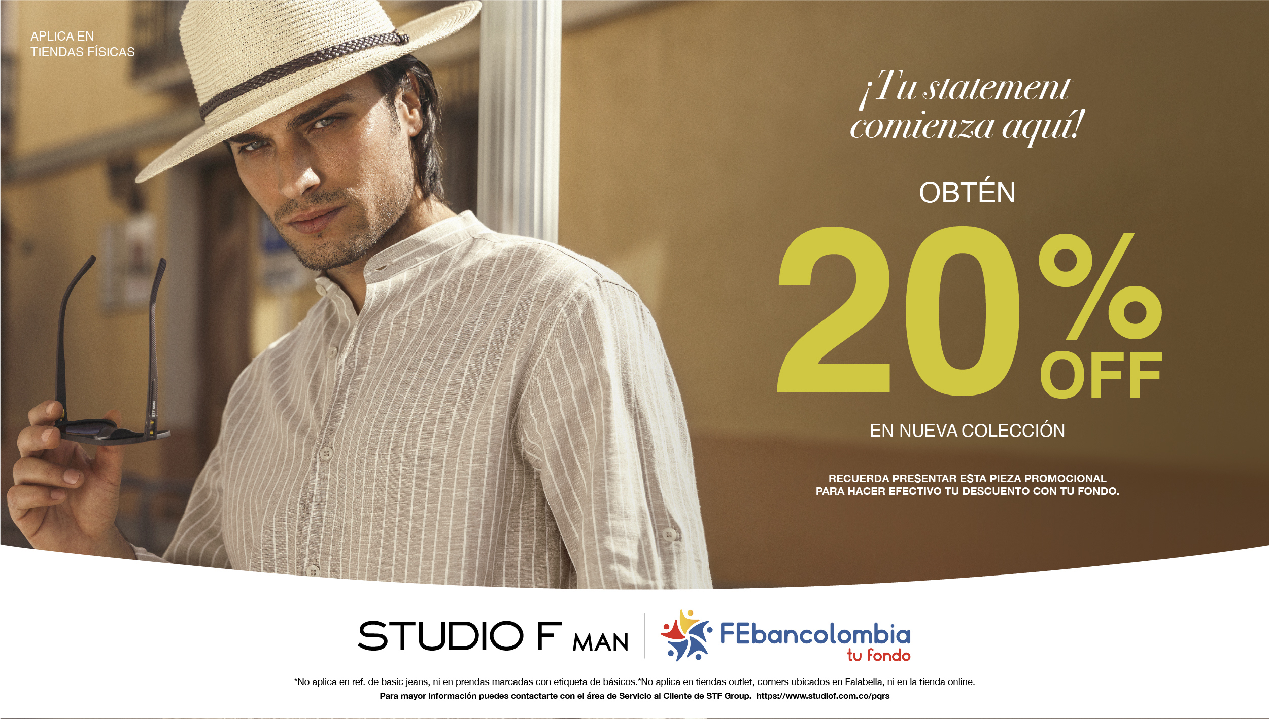 Gracias a esta alianza, tú y tus beneficiarios de primer grado de consanguinidad podrán disfrutar de un 20% de descuento en productos de línea y de última colección, exclusivamente en tiendas físicas de Studio F y Studio F Man a nivel nacional.