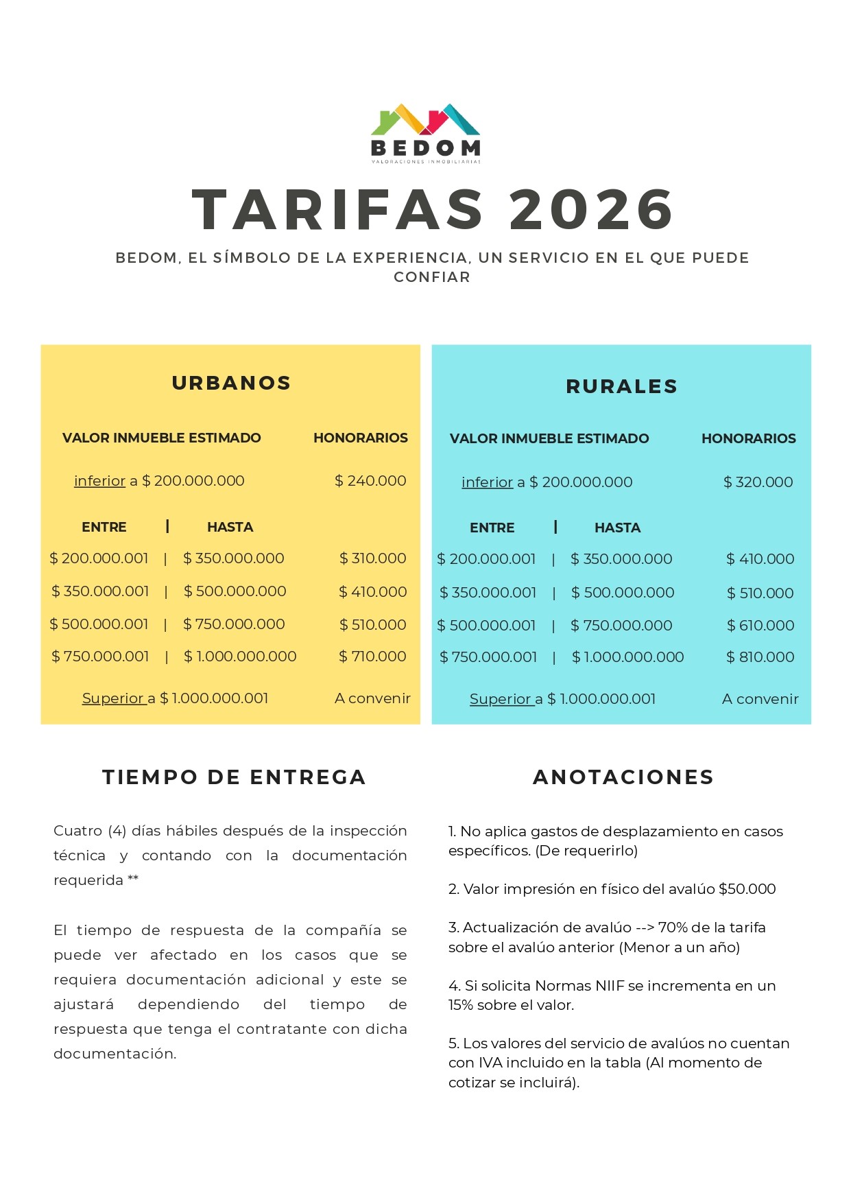 Correos electrónicos: comercial.bedomsas@gmail.com o comercialavaluos@bedom.com.co