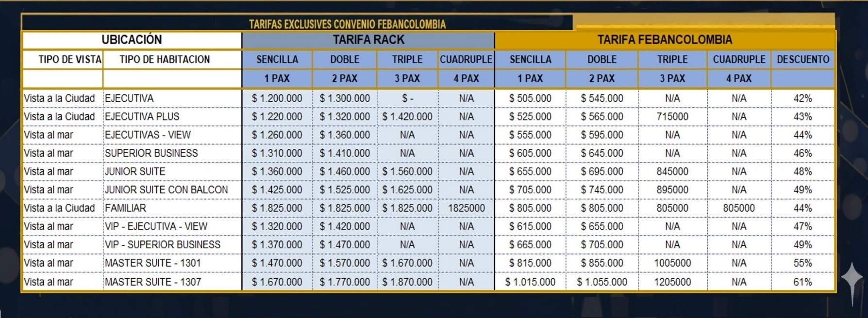 * Las tarifas son por habitación por noche, en pesos colombianos, netas.
