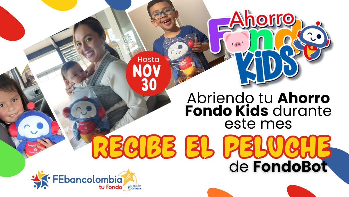 Y porque en FEbancolombia creemos que aprender también debe ser divertido, cada niño que abra su Ahorro Fondo Kids recibirá un tierno y simpático compañero: FondoBOT, el peluche del personaje del chatbot de FEbancolombia, que los acompañará en esta aventura de aprender a ahorrar y cuidar su futuro. 🤖💛
