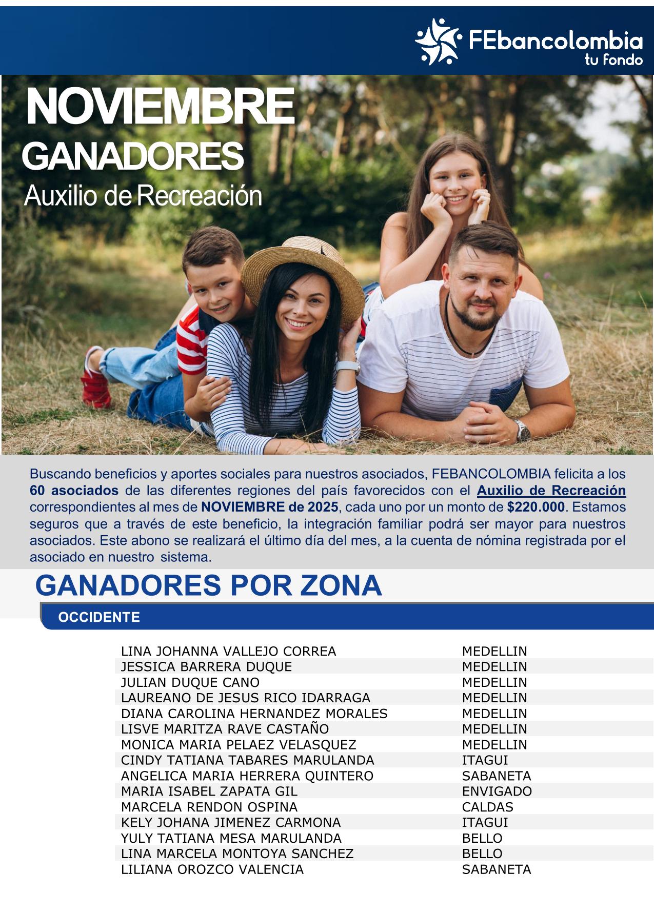 Febancolombia fomenta el esparcimiento y la integración familiar otorgando 60 auxilios mensuales de $220.000 cada uno, sorteados de forma aleatoria entre todos nuestros asociados de las diferentes regiones del país.